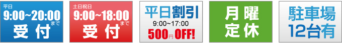 営業時間 (平日)9:00~20:00(土日祝日)9:00~18:00 まで受付